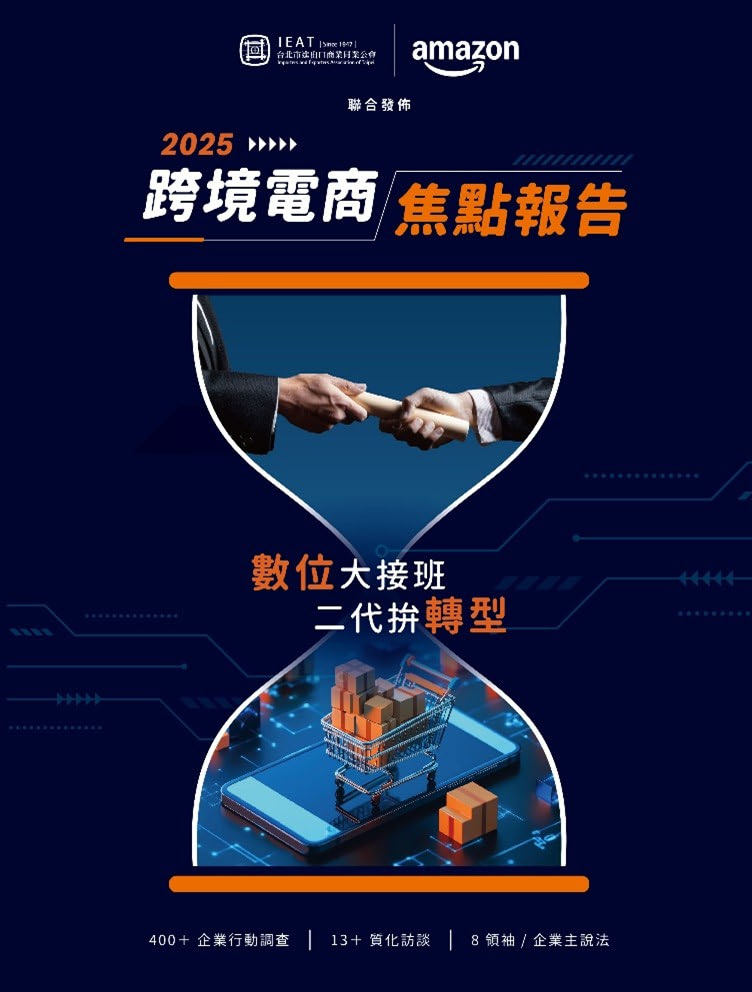 【2025年10月30日,台北訊】台灣產業正處於數位升級與轉型的關鍵時刻,若能搭配企業傳承與二代接班機會,將力助外貿企業走向國際新格局。對此,台北市進出口商業同業公會(IEAT)與亞馬遜全球開店(Amazon Global Selling)10月29日共同發布《2025跨境電商焦點報告》,就以數位轉型、二代接班、AI應用為主題,從全台400多家的企業問卷與訪談中,解析台灣中小企業在接班、品牌與外貿電商轉型上的第一手思考與現況。